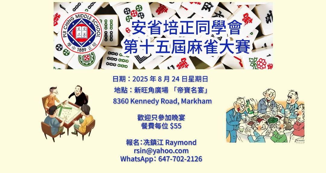 感謝同學們的支持,8 月 24 日的第十五屆麻雀大賽經已額滿。但當天的晩宴仍有空位, 歡迎大家約埋級社同學參加, 餐費每位 55 元, 報名請與捷社冼鎮江同學聯絡。 當天盈餘將全數捐予香港培正, 作為修葺中學部 E 座校舍及添置更新教學器材之用, 敬希大家踴躍支持。